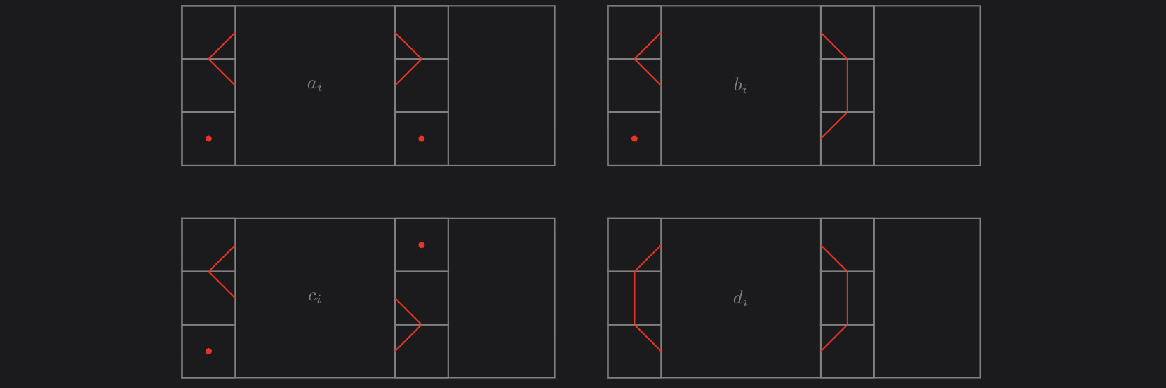 \[\sum_{n \geq 2} |S_n^c|x^n = 6^3 xT(x).\]To enumerate $S_n$, as in the $n=2$ case, the SAP starts in the first column and ends at column $i$, after which there are no SAPs. This allows us to conclude that $|S_n| = \sum_{i = 2}^{n}(6^{3(n-i)} - t_{n-i,3})f_{i},$, where $f_i$ is the number of ways the cells to the left of and including column $i$ can contain $1$ SAP that includes the left-most column. To find the identity of $f_i$, we study the $4$ cases below.