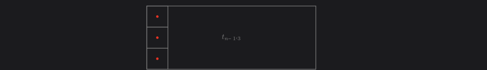 \[T_3(x) = \sum_{n \geq 2}t_{n,3}x^n = \frac{(73-414x)x^2}{(1-216x)(1-228x+2699x^2-7758x^3)}\]Proof. For $t_{n,3}$ we directly compute the generating function $T_3(x)=\sum_{n \geq 2}t_{n,3}x^n$ using the following recurrence relation \(t_{3,n} = 6^3 t_{n-1,3} + \sum_{i = 2}^{n}(6^{3(n-i)} - t_{n-i,3})f_{i},\) where $f_{i}$ is the number of mosaics in an $i \times 3$ grid that contain just one SAP that has cells in the left-most column. We similarly split $t_{n,3}$ into $S_n$ and $S_n^c$. Here let $S_n$ be the set that contains the mosaics that have just $1$ SAP that has cells in the left-most column. Therefore $S_n^c$ contains all mosaics that contain multiple SAPs and mosaics that contain $1$ SAP that does not have cells in the left-most column.